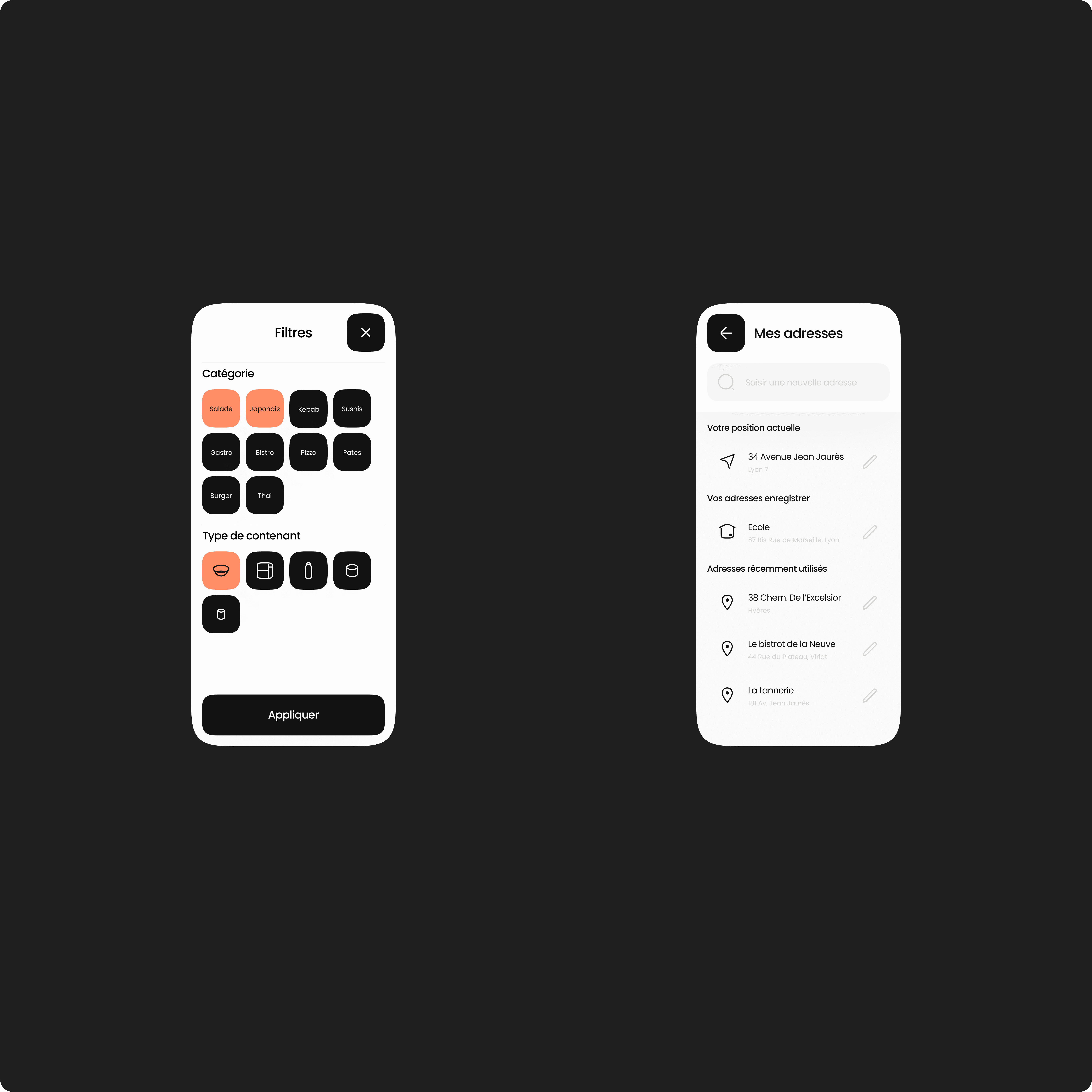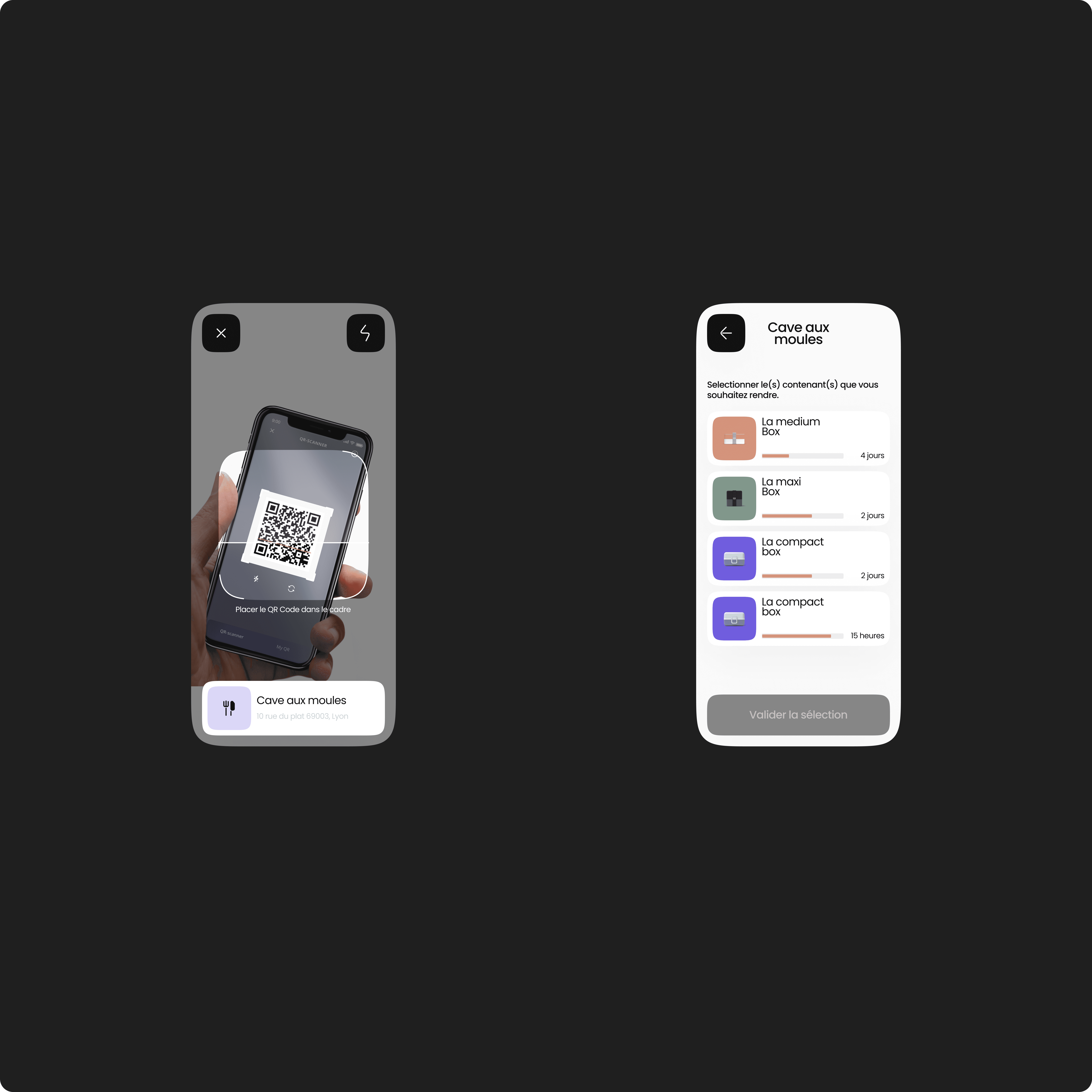 The project kicked off with extensive research on environmental impact, user behaviors, and existing alternatives. We then defined an MVP focused on simplicity and daily usability — minimizing friction and encouraging habit formation. The challenge was to create a seamless user flow that could work intuitively in real-life scenarios, like lunchtime takeout. I worked alongside a freelance team (PO, devs, and another designer) to map the core journey and build wireframes supporting the full lifecycle of a returnable container.