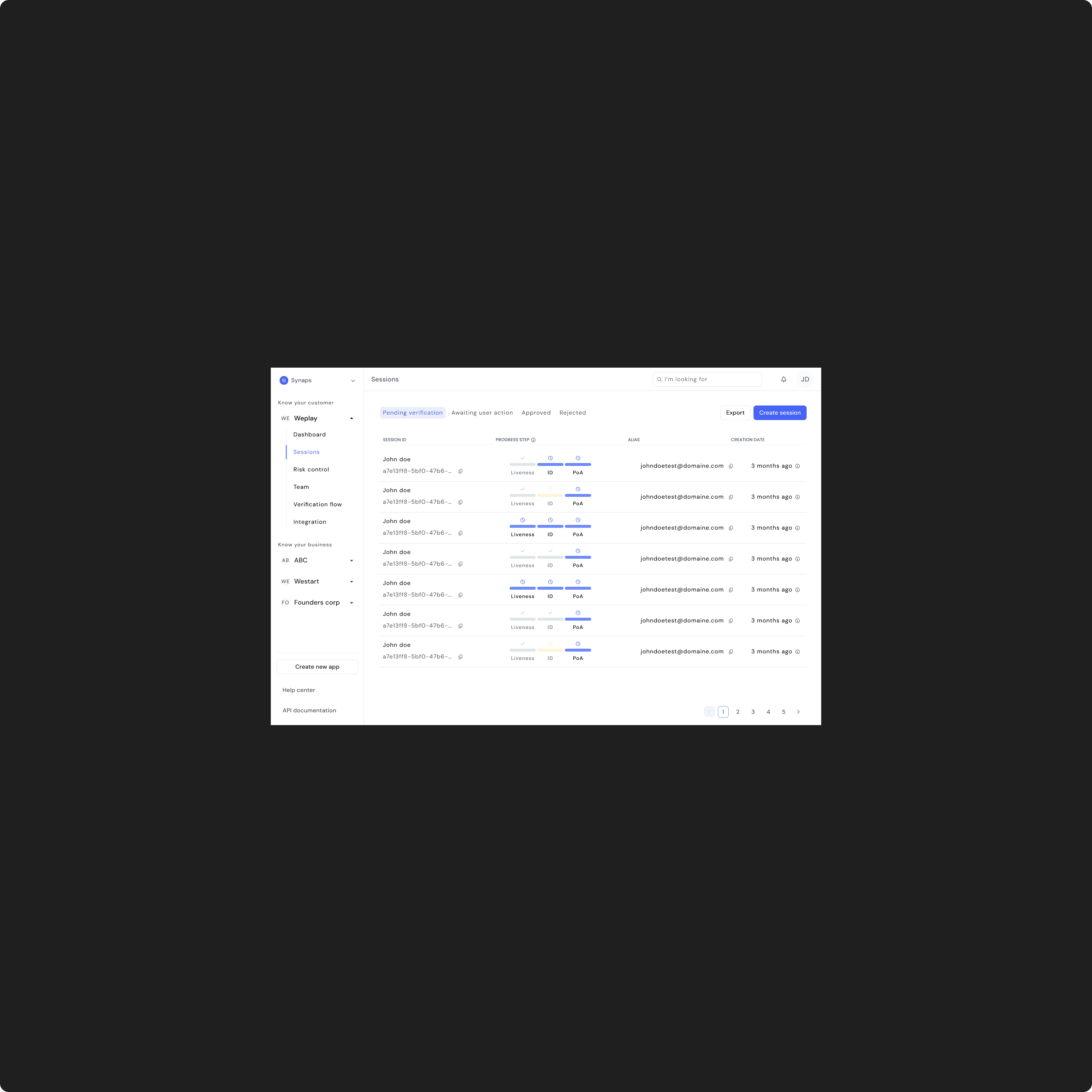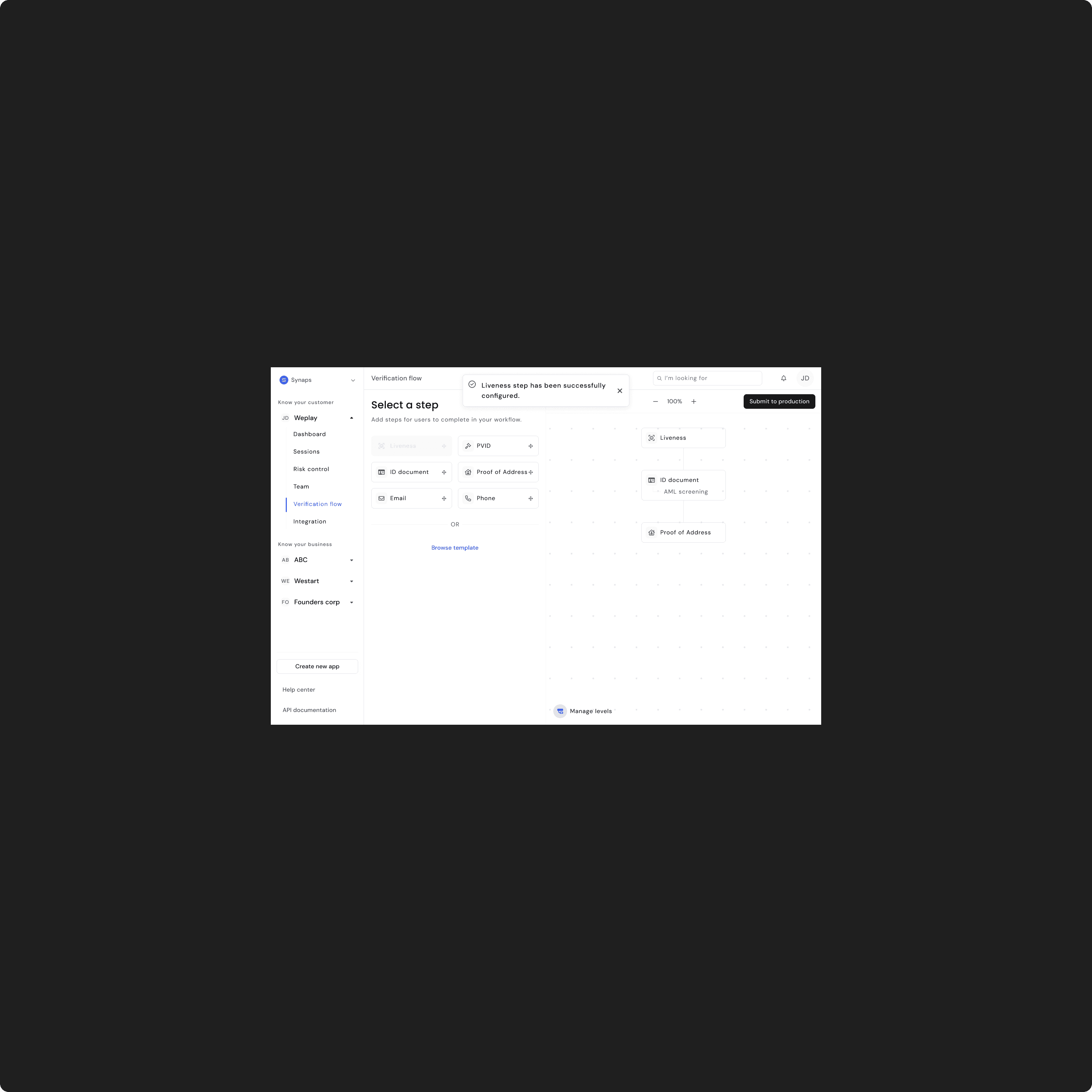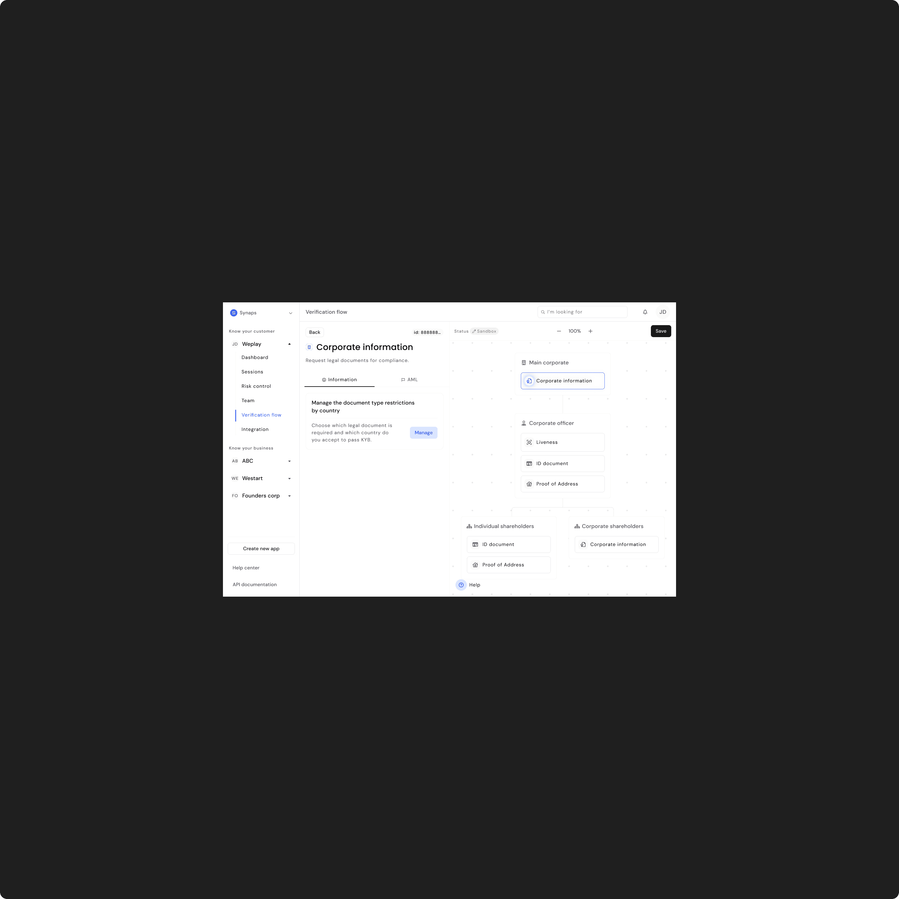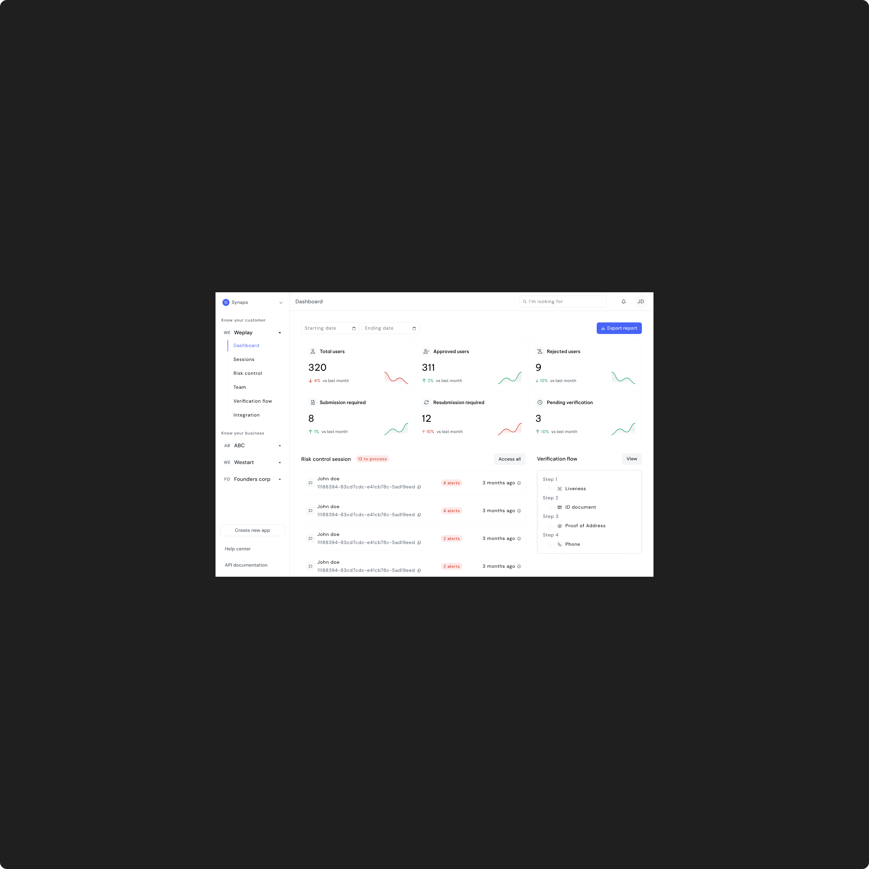 Synaps Manager is the core SaaS product of the Synaps ecosystem — a centralized platform designed to manage identity verification flows (KYC/KYB). It allows businesses to build custom verification journeys, monitor onboarding activity, track compliance metrics (KPI/AML), and manage user data — all within a unified dashboard. The main objective was to redesign the platform to make it more modular, scalable, and adaptable to a variety of client needs, while seamlessly integrating with products like Verify.